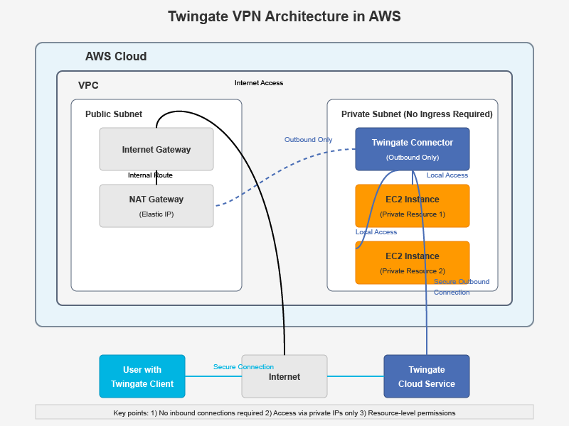 1.) Unlike OpenVPN, which requires exposing your VPN EC2 asset to a public subnet, Twingate connectors do not require an inbound security group.