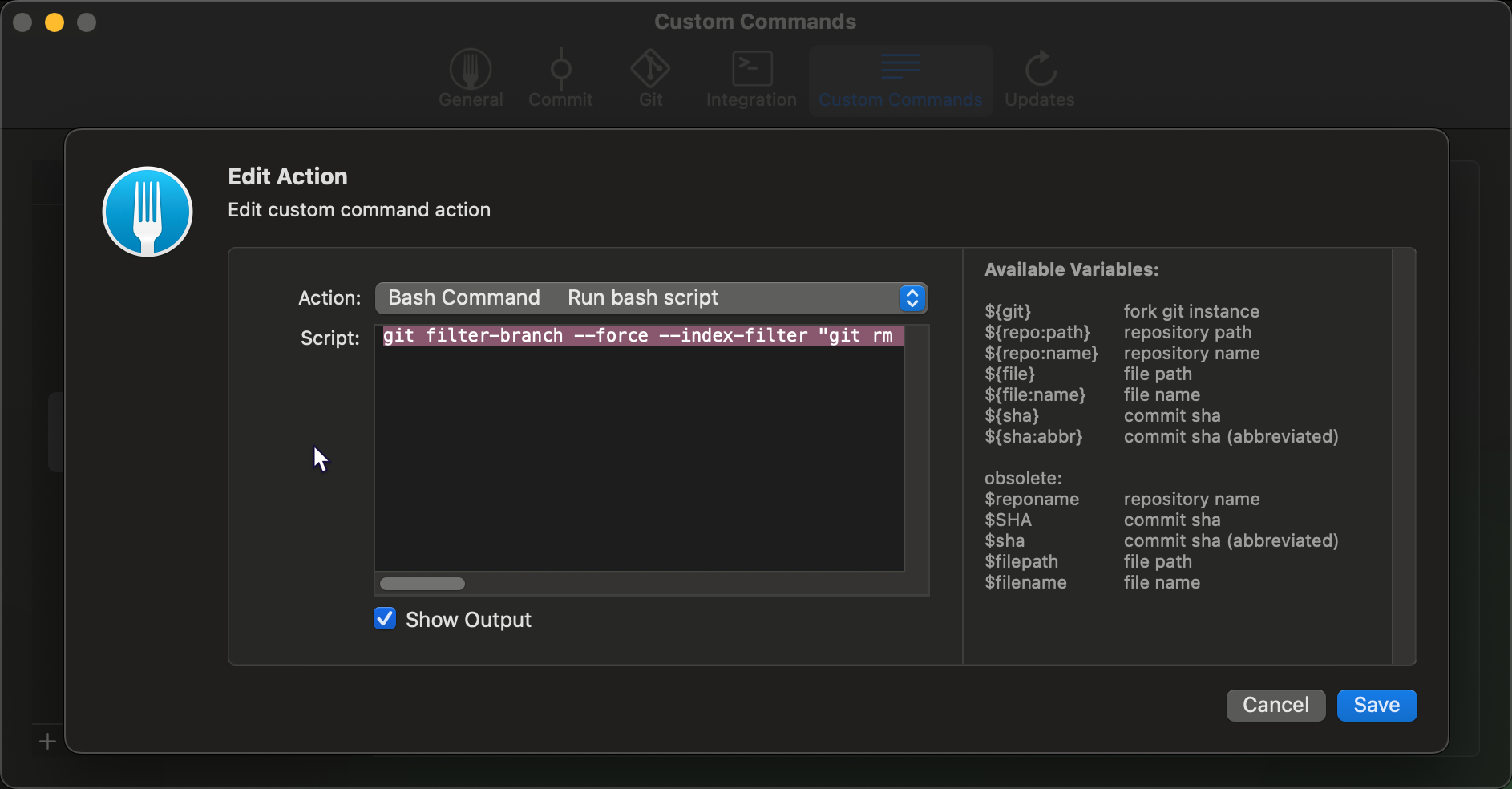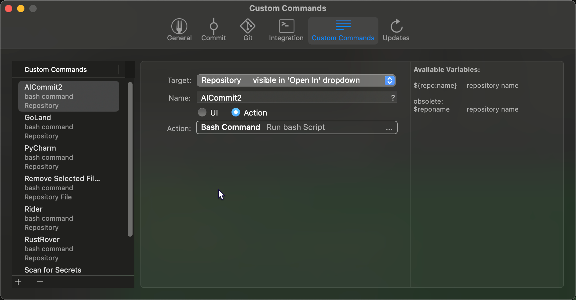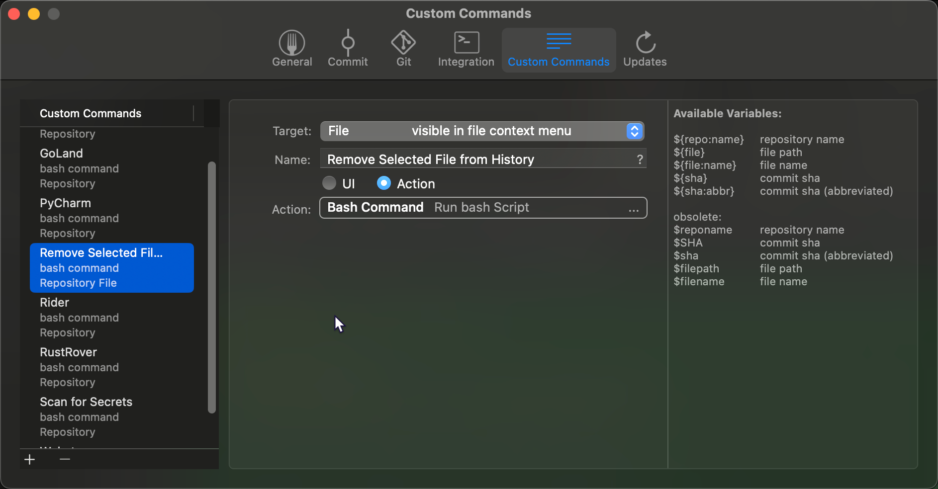 Fork UI provides a great deal of flexibility when setting up custom commands. The interface is decent and provides quick and easy GUI for all your Git needs.